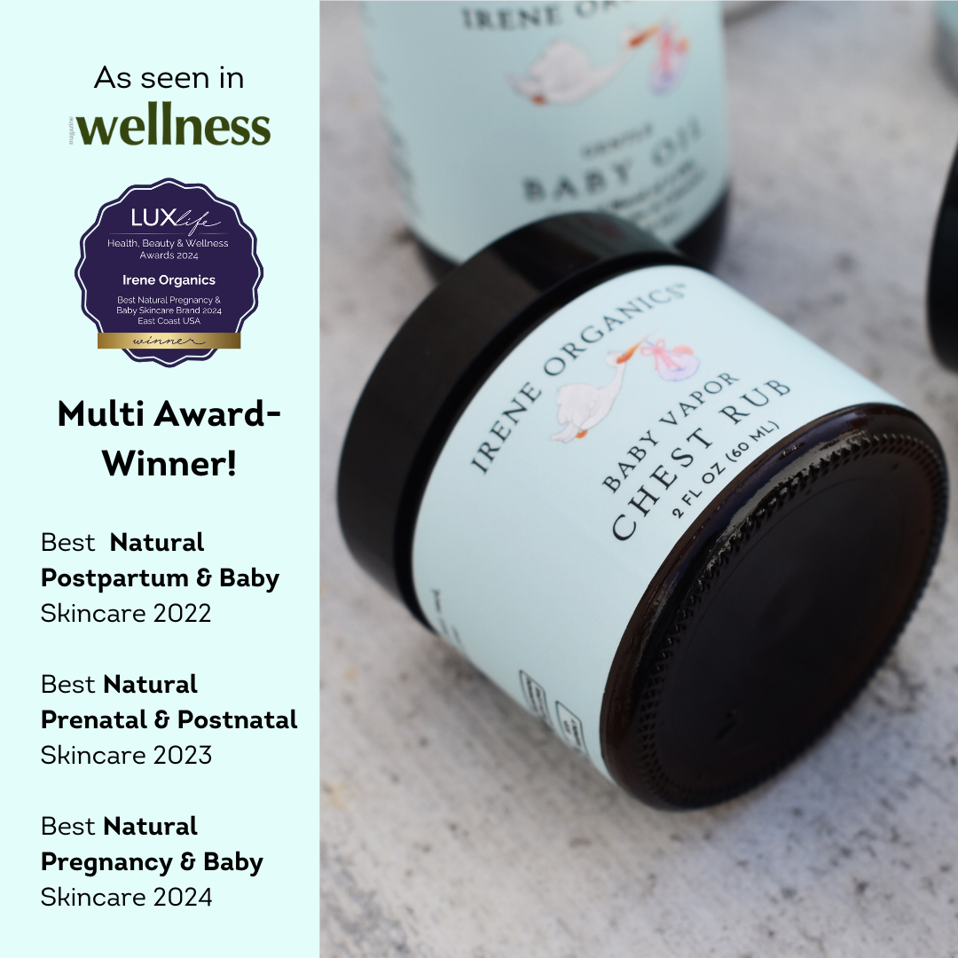Soothe your baby’s congestion and cough naturally with Irene Organics Baby Vapor Chest Rub — a clean, gentle alternative to traditional vapor rubs. Made with organic ingredients and therapeutic-grade essential oils, this balm helps open up airways, ease breathing, and promote restful sleep for sick or stuffy little ones.