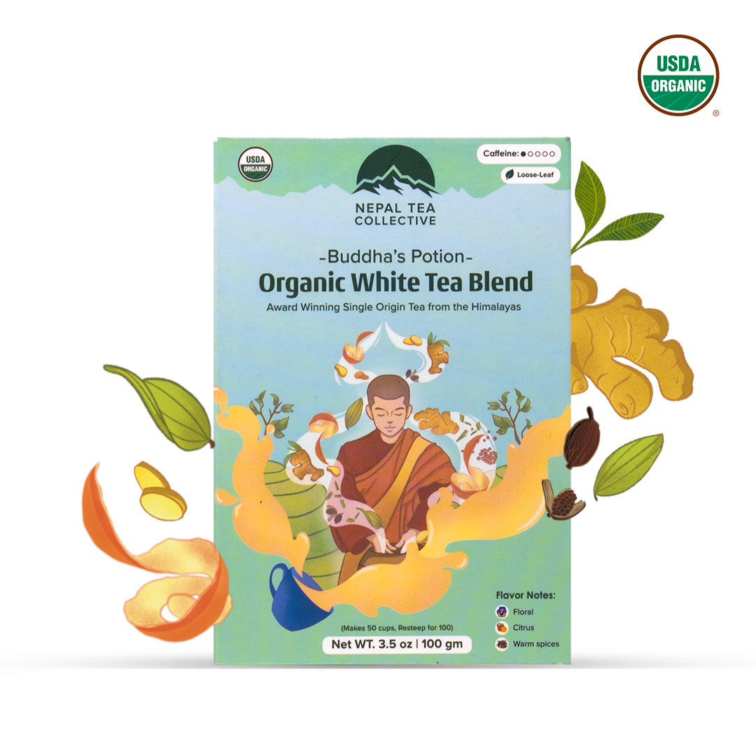 Buddha's Potion is a specialty white tea blend featuring floral notes, warm spices, mild citrus, and herbal flavors for a calming and well-rounded brew.
