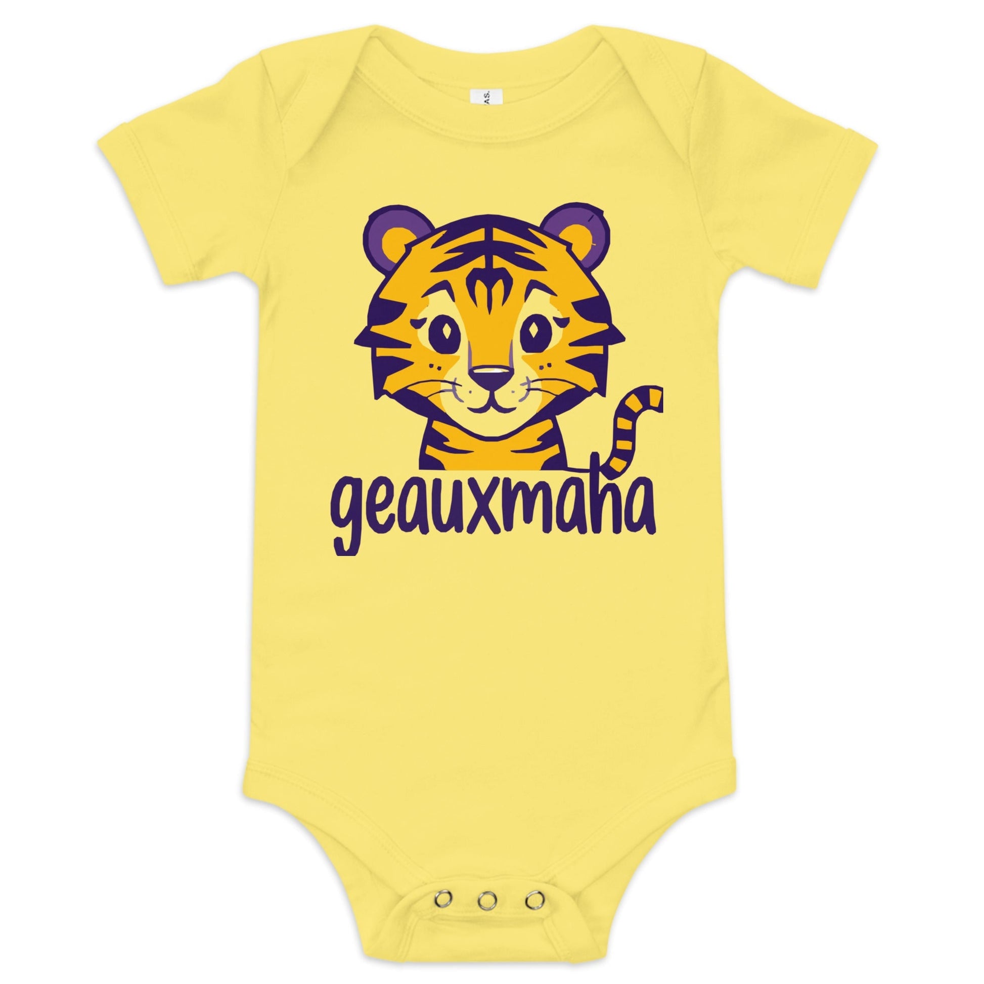 Get your little tiger ready to cheer on their team in our Geauxmaha baby onesie! Featuring a playful tiger face and bold purple-and-gold design, this super-soft bodysuit is perfect for game days, tailgates, or everyday Southern cuteness. Made with comfort in mind, the stretchy fabric and easy-snap closures make changing a breeze.