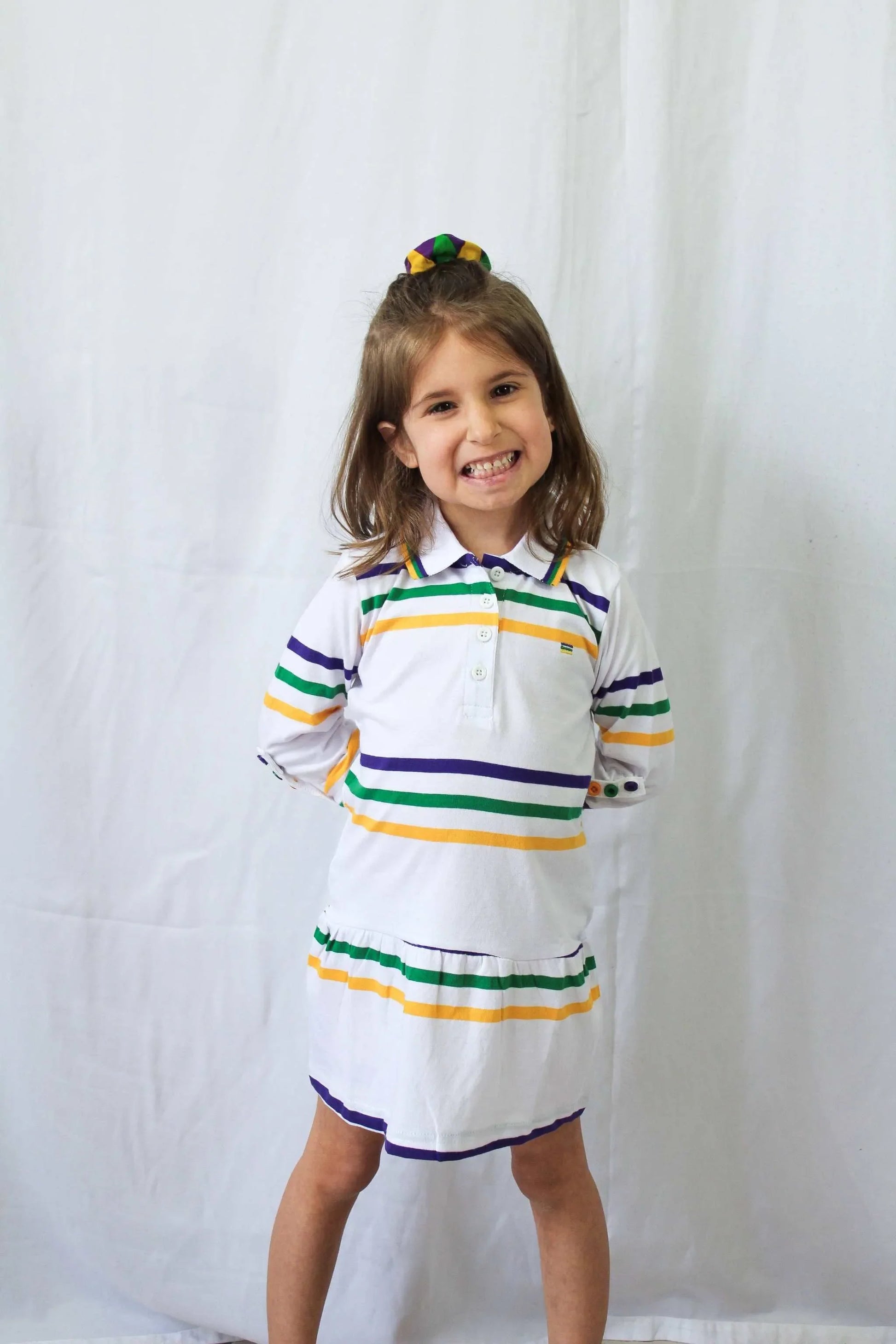 Celebrate Mardi Gras with this stylish Feel the energy of Mardi Gras with our stunning White Infinity Youth Dress. Its long sleeves and colorful stripes in purple, green, and gold make it perfect for any celebration. Dress to impress and show off your spirit with this must-have addition to your wardrobe! This dress features small lines of green and gold are around the edge of the collar.