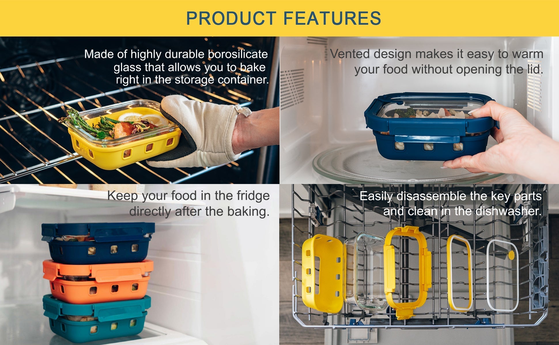 - Bake and Store: Oven-safe borosilicate glass allows for baking directly in the storage container (lid should not be used in the oven).