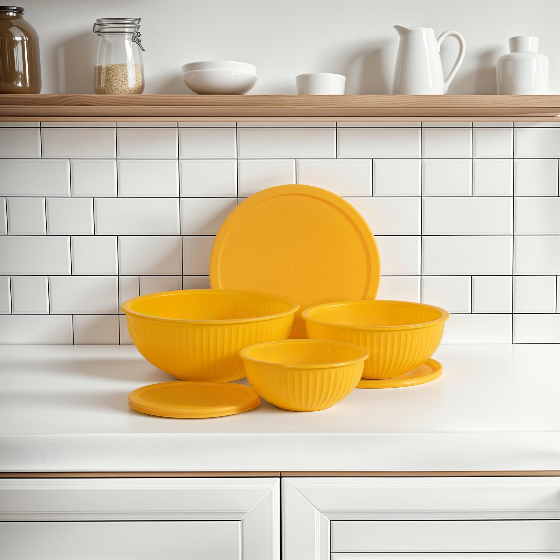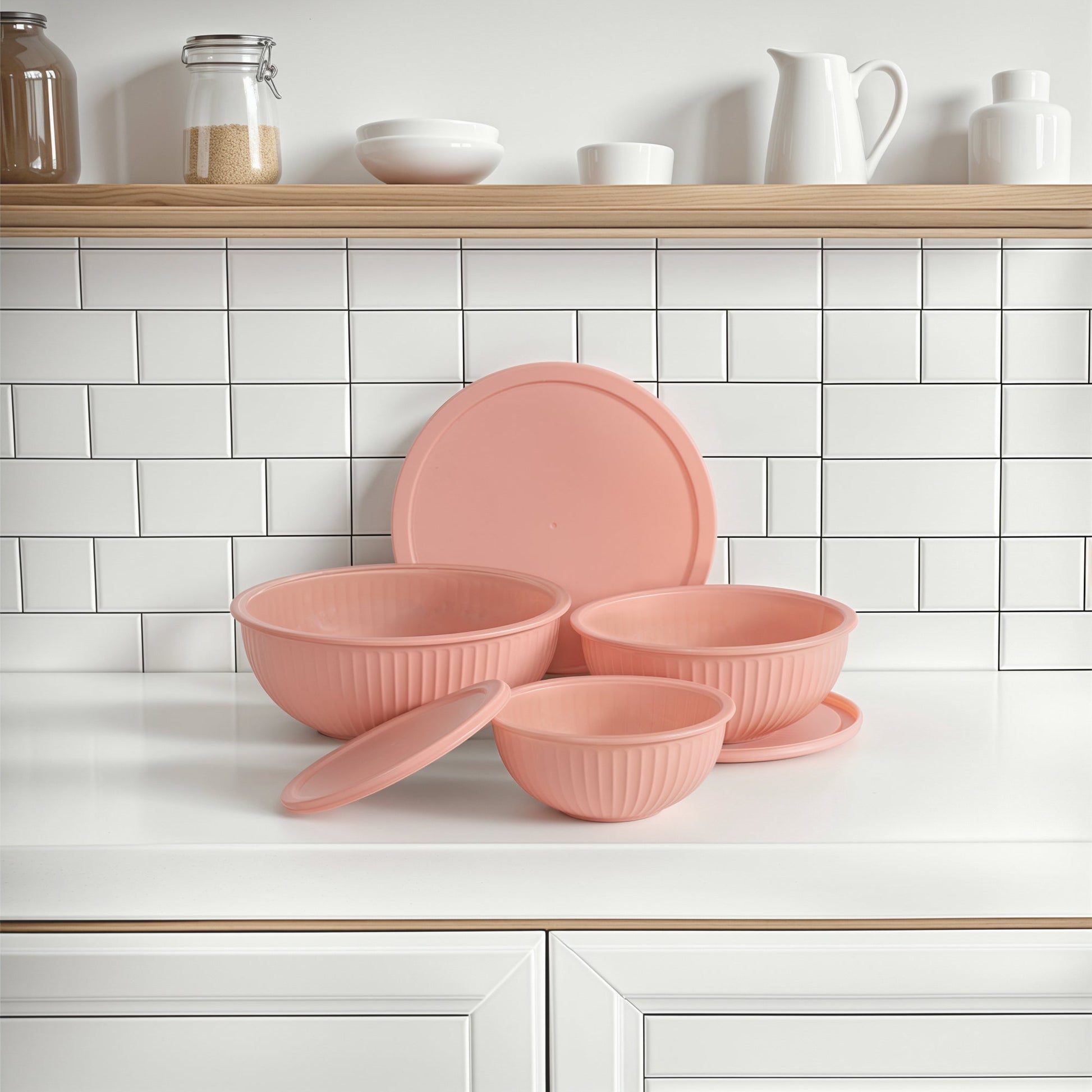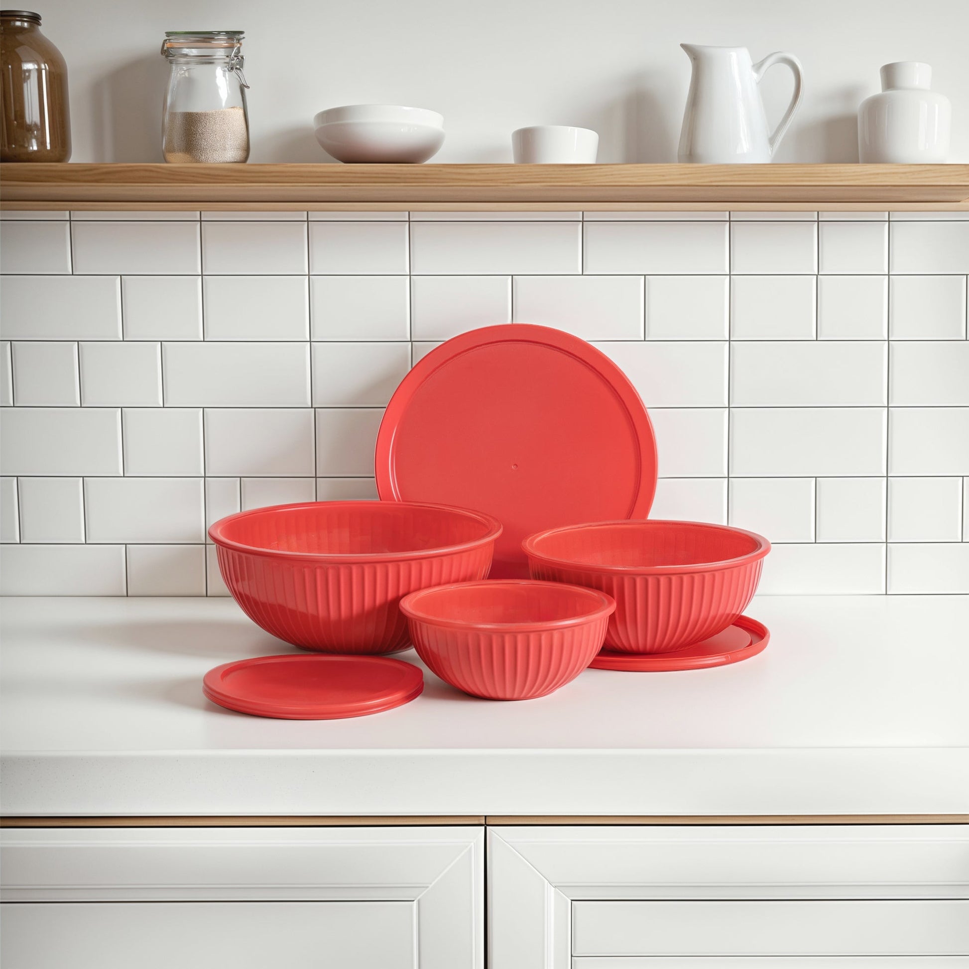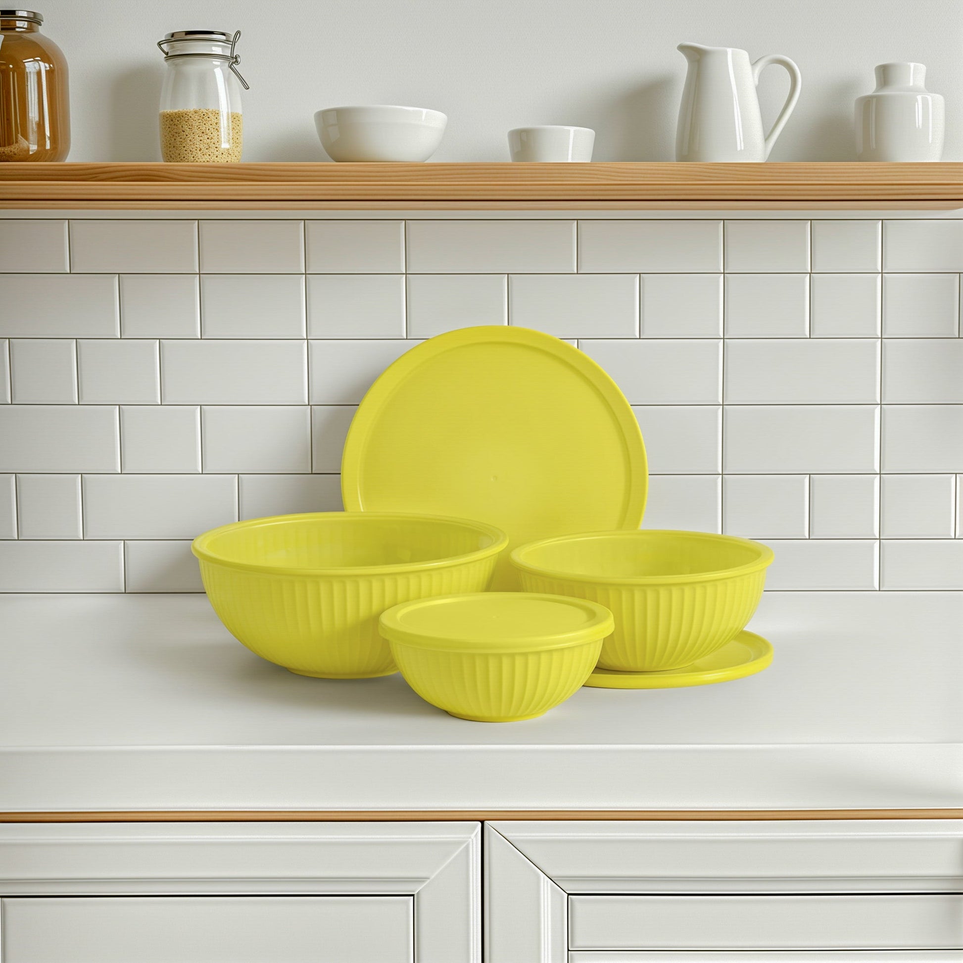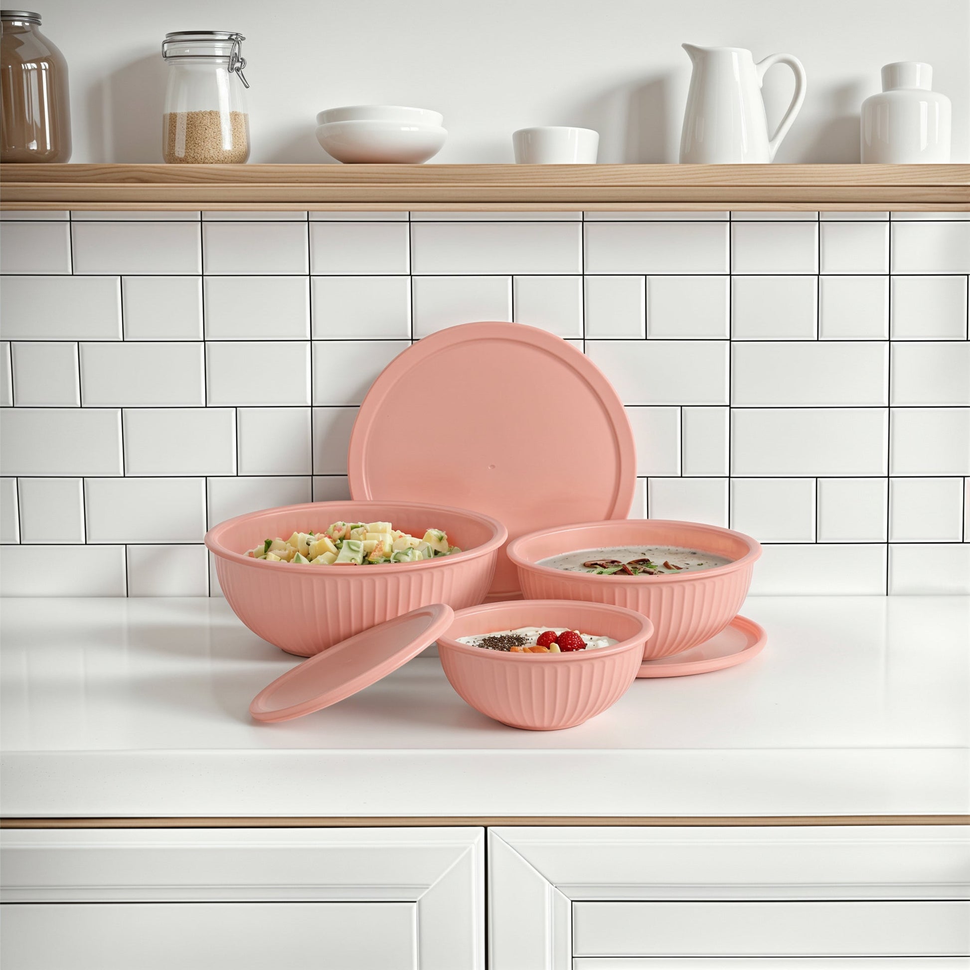 Available Sizes: Each set includes three bowls with matching pressure-fit covers for secure storage.